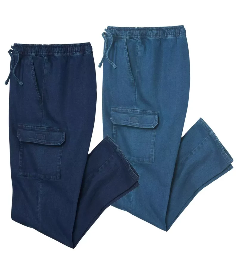 Lot de 2 jeans cargo en denim extensible, coupe détente avec ceinture élastiquée et cordon de serrage. Confort et style assurés pour l’été !